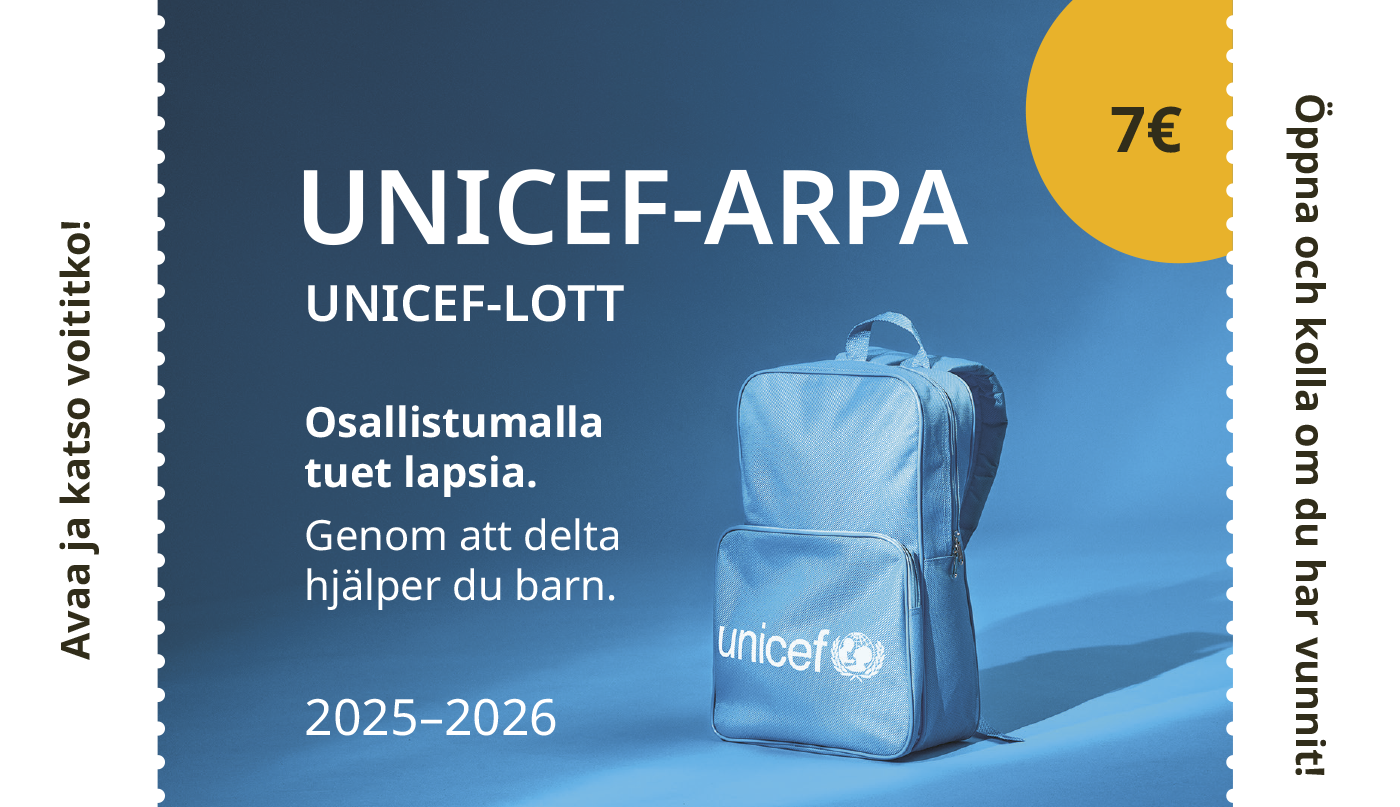 Osallistumalla UNICEF-arpajaisiin tuet työtämme jokaisen lapsen hyväksi kaikkialla maailmassa. Samalla voit voittaa jonkin upeista palkinnoista 10 000 euron lahjakortista sähköpyörään. Lunasta arvat ja katso, mitä olet voittanut.